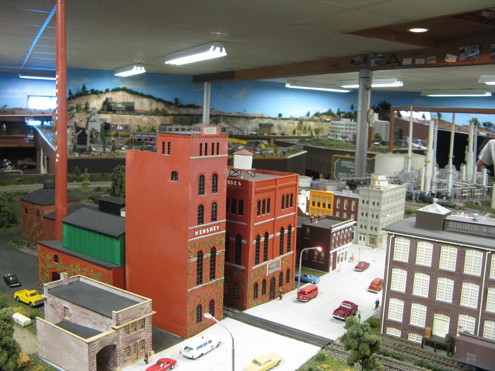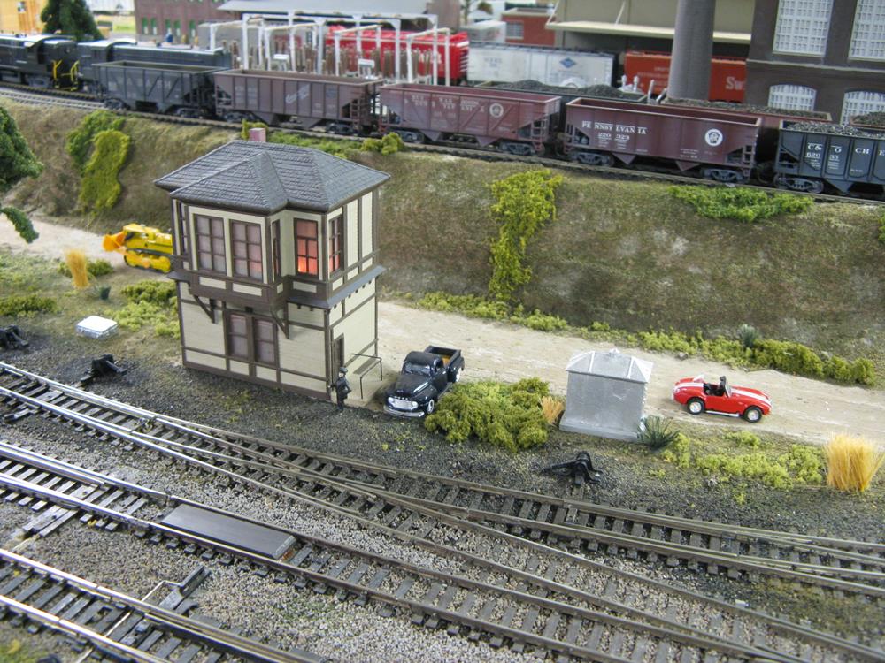 Jerry’s freelance layout modeling the Reading and Pennsy is located in his 28′ x 40′ basement. It is a loop-to-loop design with 40′ radius curves so he can run large steam equipment. His scenery is in a near complete state. Jerry said he has about ten scale miles of mainline and a branch line 2 1/2 scale miles long. There is an interchange yard for exchange of traffic between the two railroads. There are many trees and over a hundred buildings. The layout has been converted to DCC from its original construction as a DC layout.